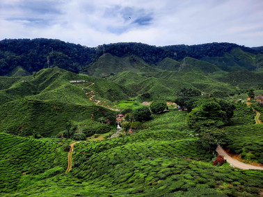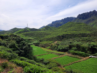 Irgendwann wurde der Weg besser und wir sind durch die Gemüseplantagen gewandert. Die Sprenkleranlagen haben uns auch ganz gut abgekühlt... Das letzte Stück des Weges führt direkt durch die Teebüsche der Cameron Valley Tea Plantage. Soweit das Auge reicht, nur grüne Hügel mit grünen Büscheln voller Tee. Am Ende wird man von einem Teehaus mit Ausblick erwartet. Leider ist dort alles sehr touristisch, viele Menschen und es gibt nur teures westliches Essen à la Chicken Nuggets... Wir haben uns aber trotzdem gemeinsam hingesetzt und einen Teh Tarik getrunken, das Nationalgetränk Malaysias. Süßer schwarzer Tee mit Kondensmilch, super lecker! :-)