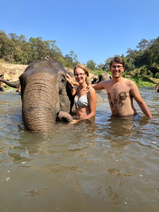 Zur Unterstützung der Elefantenverdauung bekommen sie jeden Tag Kräuterbällchen voller Tamarinde, Kurkuma, Zuckerrohr und diversen Kräutern. Die Zutaten werden traditionell zermörsert und dann mit Bananen zu kleinen Bällchen geformt. Dann folgte ein Schlammbad, das den Menschen mindestens genau so viel Spaß gemacht hat wie den Tieren. 😉 Und als dann alle von oben bis unten mit Dreck beschmiert waren, sind wir alle ins kalte Wasser zum Abspülen. Wer kann schon sagen, einem Elefanten den Rüssel gewaschen zu haben? 😉