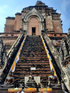 Tagsüber sind wir ganz entspannt durch die schöne Altstadt gebummelt. Wir hatten befürchtet, dass Chiang Mai ein zweites Bangkok wird, aber die Atmosphäre ist eine ganz andere. Ruhiger, niedlicher, viele nette Cafés und Restaurants und natürlich viele Tempel. Einige haben wir uns angeschaut, unter anderem den Wat Chedi Luang mit seiner großen Ruine in der Mitte und den Wat Phra Singh. Beide haben wirklich große gepflegte Anlagen und sind hübsch hergerichtet. In einem anderen Tempel gab’s dafür ein Becken mit großen Fischen, ein Plastik-Skelett neben dem Buddha und lustiger Musik – mal was anderes. 😉