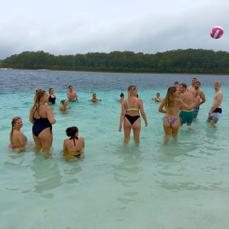 Den Nachmittag wollten wir am Lake McKenzie verbringen. Dieser See hat einen unglaublich weißen Sandstrand und leuchtet türkisblau - zumindest im Sonnenschein. Als wir alle dort ankamen, war es grau und wolkenverhangen. Kaum waren die ersten im Wasser, fing der Regen erst richtig an. Ab da hat man die Wahl ob man vom Regen durchnässt werden will oder einfach ins Wasser geht - wir haben uns für das Wasser entschieden. Tatsächlich macht Schwimmen im Regen auch großen Spaß und unser Wilson hatte auch eine gute Zeit. ;-)
