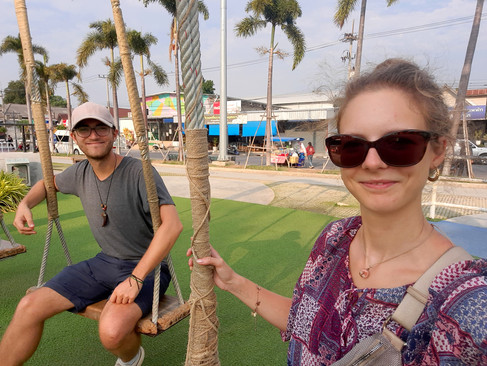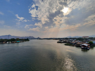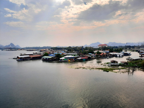 Etwa zwei Stunden von Bangkok entfernt liegt eine mittelgroße Stadt namens Kanchanaburi. Nicht allzu viele Touristen verirren sich hierher, aber gerade das gefällt uns ja. Wir sind nachmittags eine Runde durch die Stadt gelaufen, so richtig hübsch ist sie allerdings nicht. Die Lage direkt am Fluss Kwai ist aber wirklich schön und es gibt viele schwimmende "Häuser" und Restaurants. Nicht so richtig ins Bild passt der moderne gläserne Skywalk, aber der Blick ist wirklich fantastisch! Und besonders lustig sind die roten Samtpantoffeln für die Schuhe. ;-) Eine Tüte Chips zur kleinen Stärkung und eine Runde Schaukeln mussten auch noch sein!