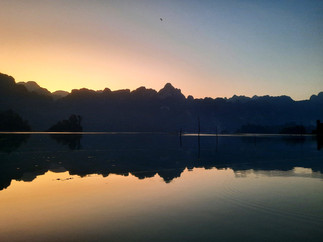 Dank der netten Organisation unserer Gastgeber stand pünktlich um 9:00 Uhr ein Van vor der Tür und hat uns gemeinsam mit zwei Holländerinnen abgeholt. Nach einer Runde durch's Dorf war der Van dann auch voll und wir sind Richtung Cheow Lan Lake gefahren. Auf dem Weg gab's noch einen Stopp am lokalen Markt, anschließend haben wir am großen Bootspier den Guide Pinocchio (so nennt er sich zumindest selbst) für die nächsten beiden Tage getroffen. Nach etwas Wartezeit sind wir alle in eins der typischen Longtailboote gestiegen und dann 1,5 Stunden über den See gedüst.